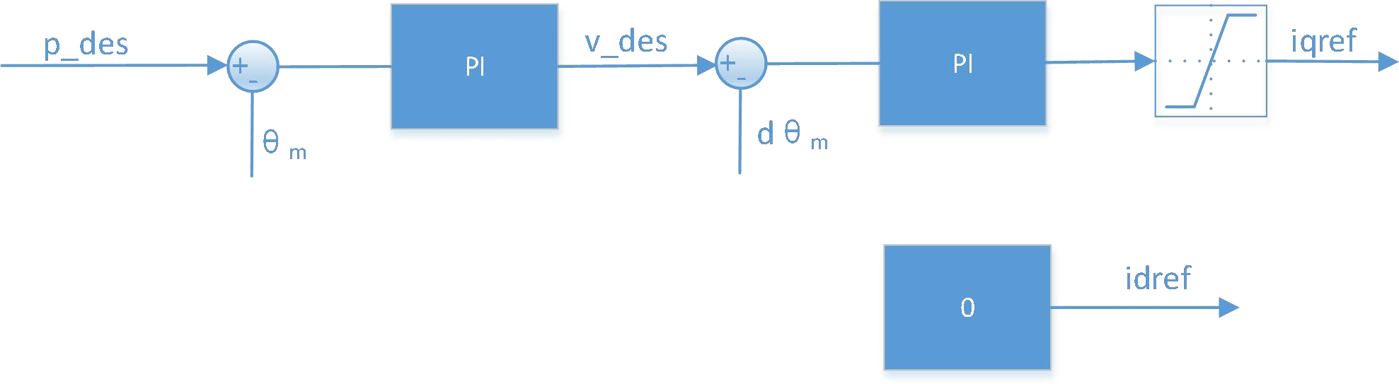 速度ループの出力指令の後に電流指令飽和段を追加し、電流ループの指令値を所定範囲内に制限します。