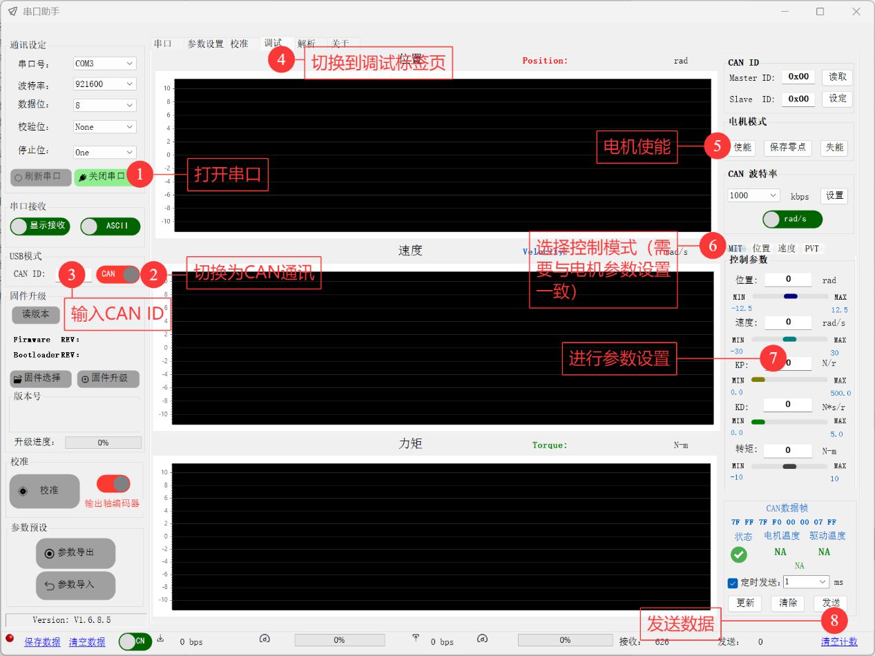 制御モードを選択後、必要に応じて対応するパラメーターボックス(位置、速度、力矩(トルク)など)に数値を入力するか、「KP」「KI」「KD」などの制御パラメーターを調整し(図示⑦)、モーター運転パラメーターの詳細設定を完了させます。