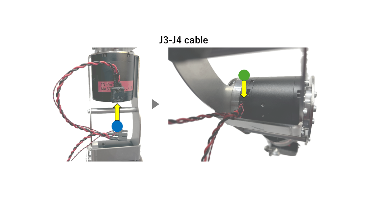 Connect the J3 connector to the J3 motor (upper arm) and the J4 connector to the J4 motor (elbow). Route all cables along the back side of the upper arm. Since the J4 connector is located close to the sheet metal, be careful not to damage the cable.