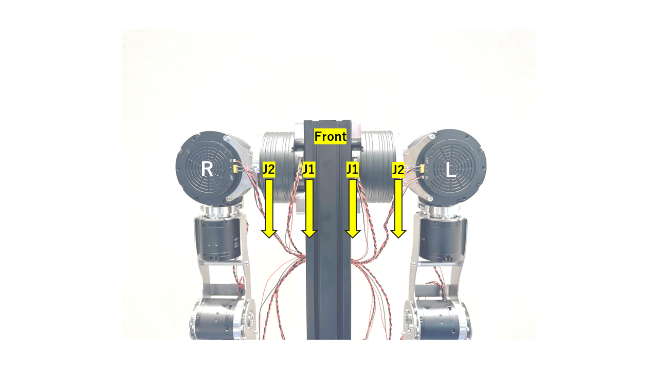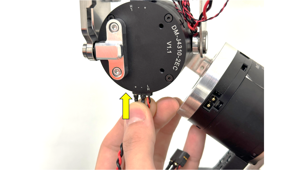 Plug the J1 and J2 connectors into the J1 and J2 motors. Route the J1 cable through the robot’s armpit toward the back. Connect the J2 cable to the J2 motor, then bend the cable downward to ensure it’s properly routed.