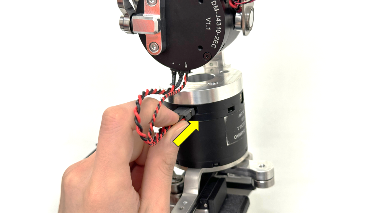 Connect the end-effector motor to the system. First, connect the J7–J8 cable to the underside connector of the J7 motor.